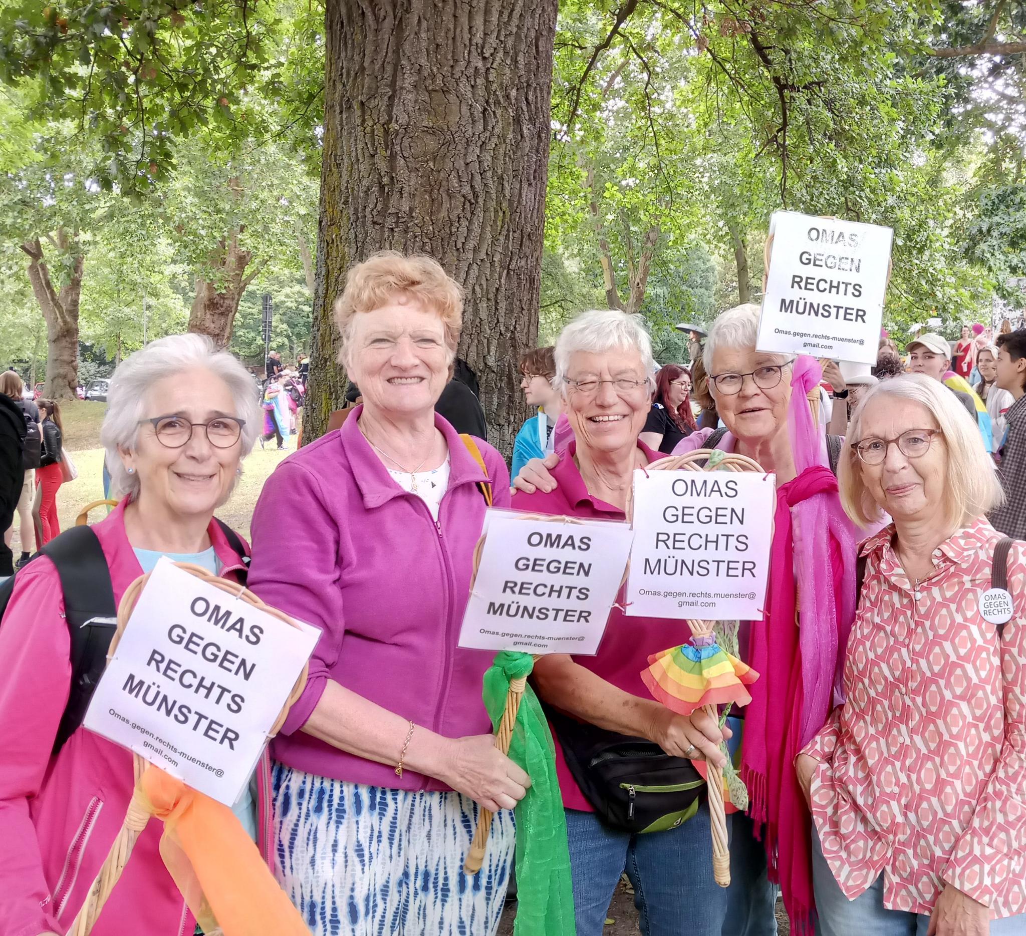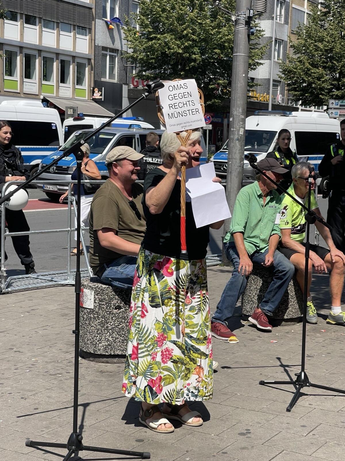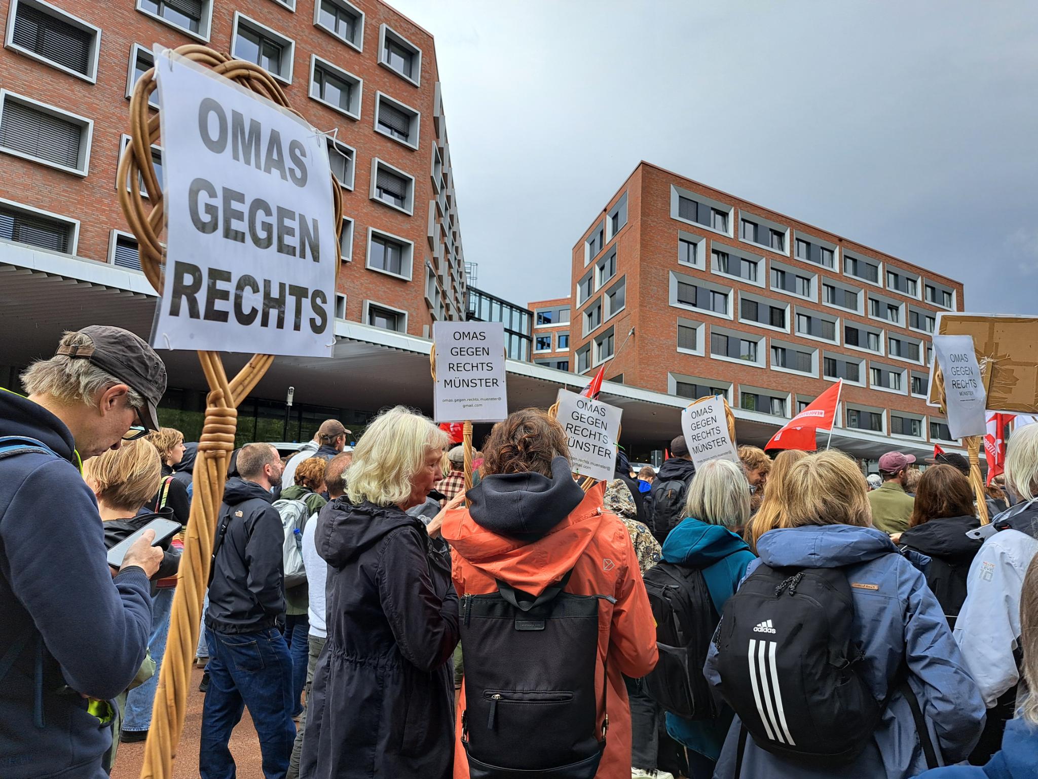 Am 5. und 19. Juli stellten sich in Münster hunderte Menschen rechtsextremen Aufmärschen entgegen. Es beteiligten sich zahlreiche Initiativen und Einzelpersonen, darunter auch die OMAS GEGEN Rechts Münster, die bei den Kundgebungen als Teilnehmerinnen und Sprecherinnen aktiv waren.An beiden Terminen gelang es, mit lautstarkem und friedlichem Protest ein deutliches Zeichen gegen Rechtsextremismus zu setzen. Die Veranstalter betonten, dass solche Aktionen wichtig seien, um rechten Strukturen in Münster keinen Raum zu lassen.