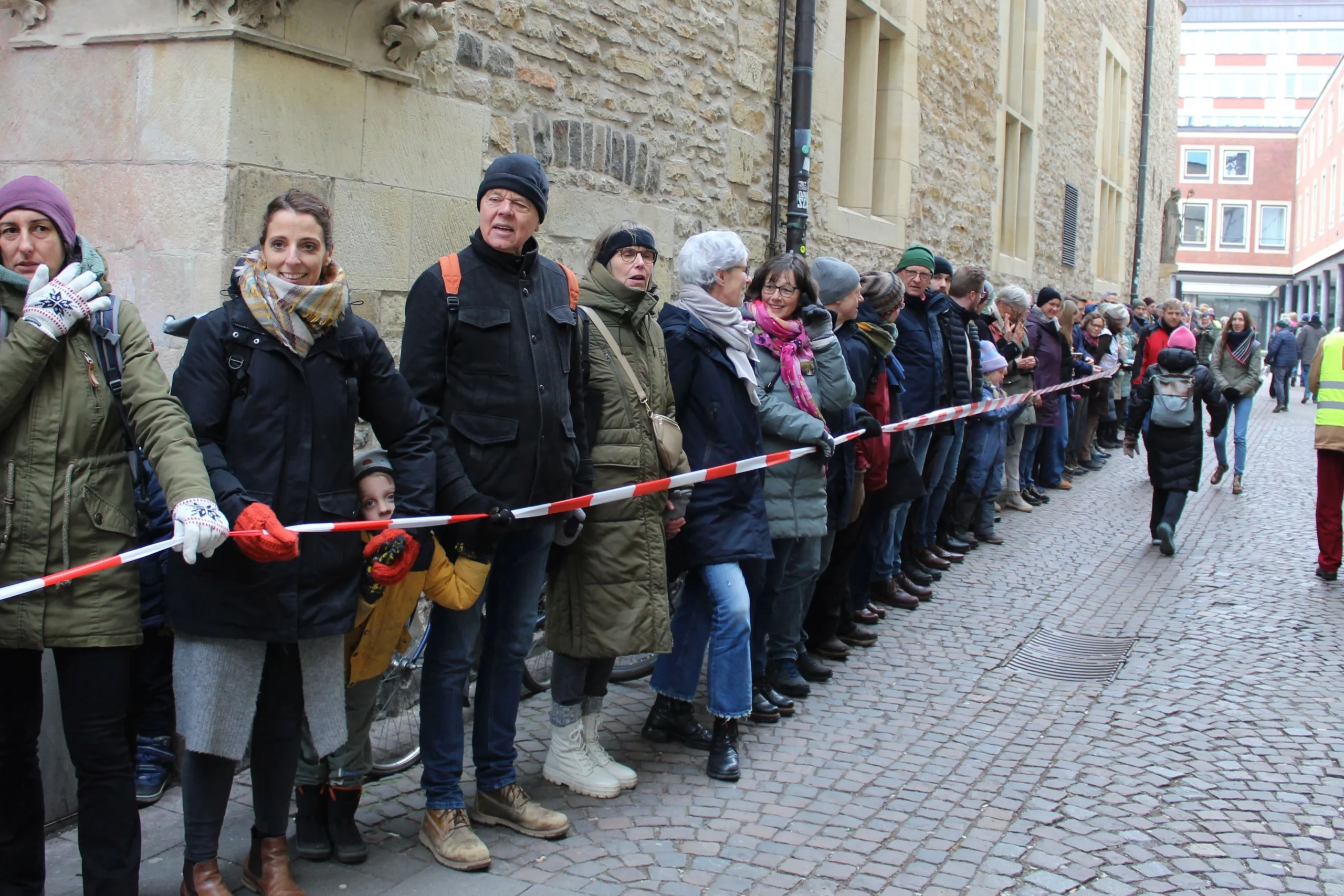 Menschenkette für die Demokratie Ein zentrales Ereignis war die Menschenkette am 8. Februar 2025 rund um das historische Rathaus in Münster. Unter dem Motto „Demokratie umarmen und schützen“ riefen die OMAS GEGEN RECHTS Münster gemeinsam mit Unterstützerinnen und Unterstützern dazu auf, ein sichtbares Zeichen gegen Rechtsextremismus und für gesellschaftliche Vielfalt zu setzen. Die Aktion fand im Rahmen eines bundesweiten Aktionstages statt und wurde von zahlreichen Bürgerinnen und Bürgern unterstützt. Ziel war es, die Bedeutung demokratischer Grundwerte in den Mittelpunkt des öffentlichen Bewusstseins zu rücken. Hier gibt es ein Video zur Menschenkette.