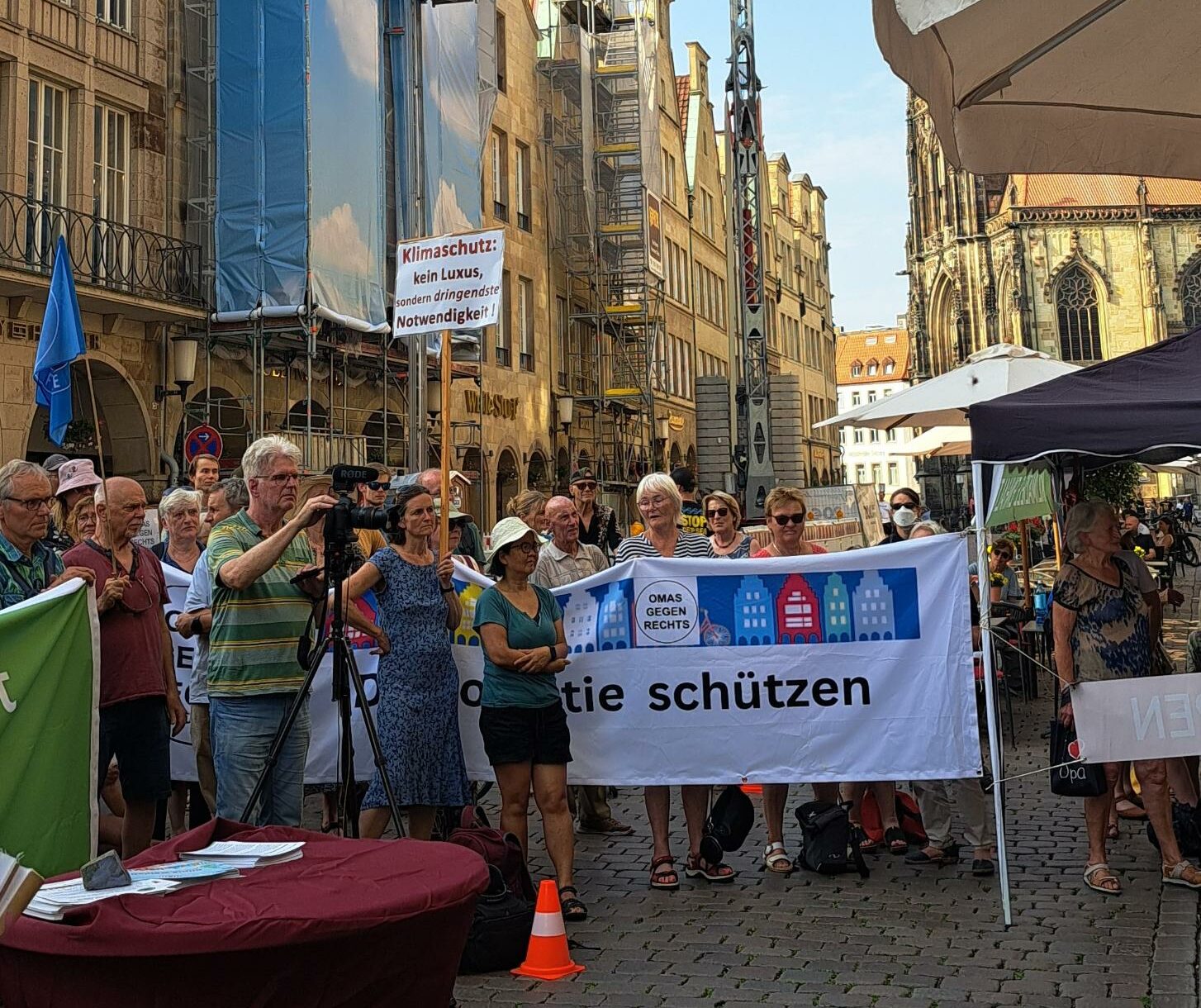 Trotz der extremen Temperaturen nahmen auch die OMAS GEGEN RECHTS an der Veranstaltung auf dem Prinzipalmarkt teil. Gemeinsam mit vielen anderen Interessierten hörten sie die Antworten der Bürgermeisterkandidat*innen auf Fragen zum drängenden Thema Klimaschutz. Dabei wurde diskutiert, mit welchen Maßnahmen die Stadtverwaltung unter einer neuen Bürgermeisterin oder einem neuen Bürgermeister den Folgen des Klimawandels begegnen kann. Klimaschutz ist auch ein zentrales Anliegen der OMAS GEGEN RECHTS. Die Ausrichter organisierten eine rundum gelungene Veranstaltung.