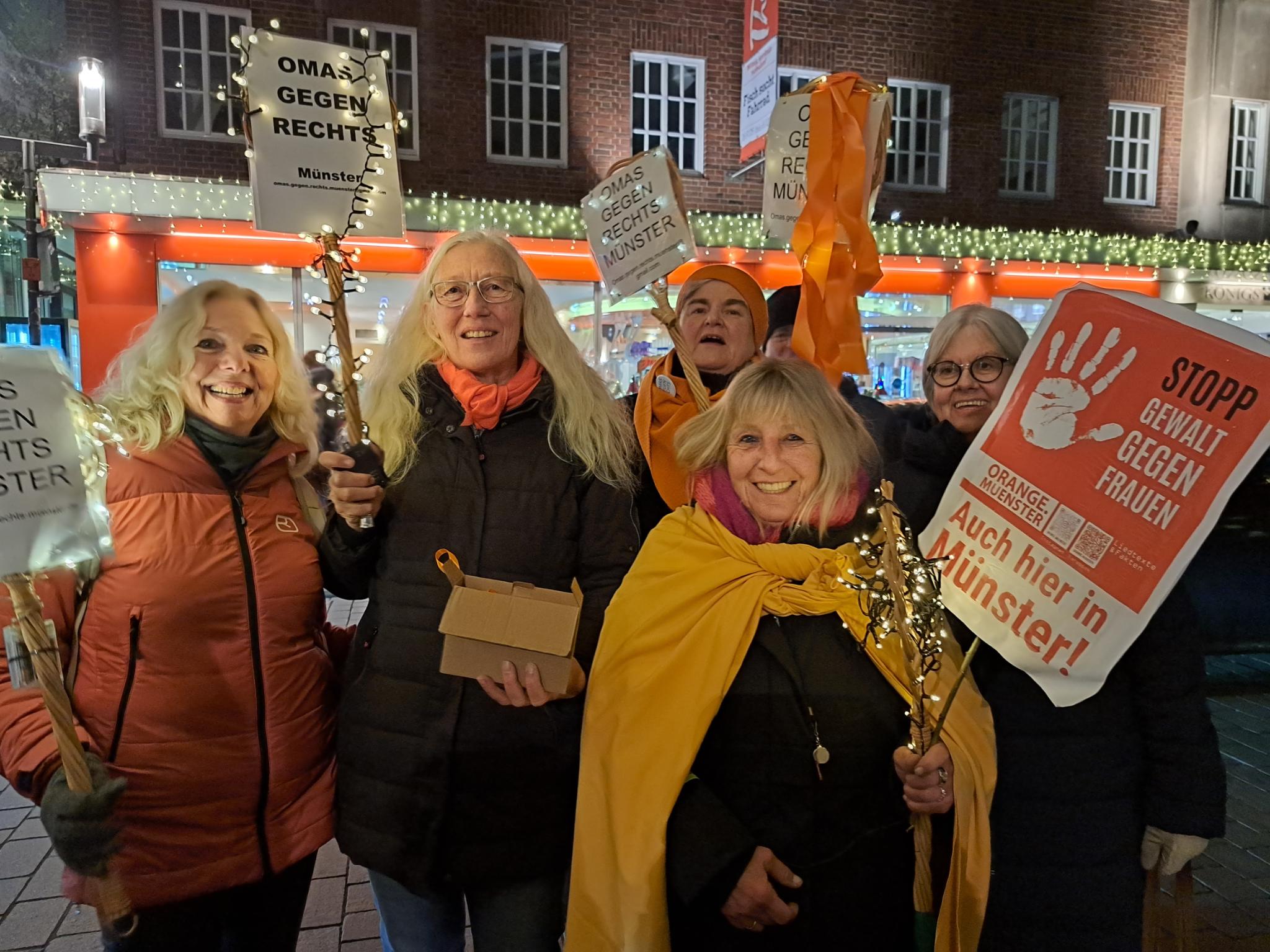 Am 25. November, dem Internationalen Tag gegen Gewalt an Frauen und Mädchen („Orange Day“), waren wir OMAS GEGEN RECHTS Münster Teil des Bündnisses „Orange Münster“ und sind gemeinsam mit vielen anderen durch die Innenstadt gezogen.