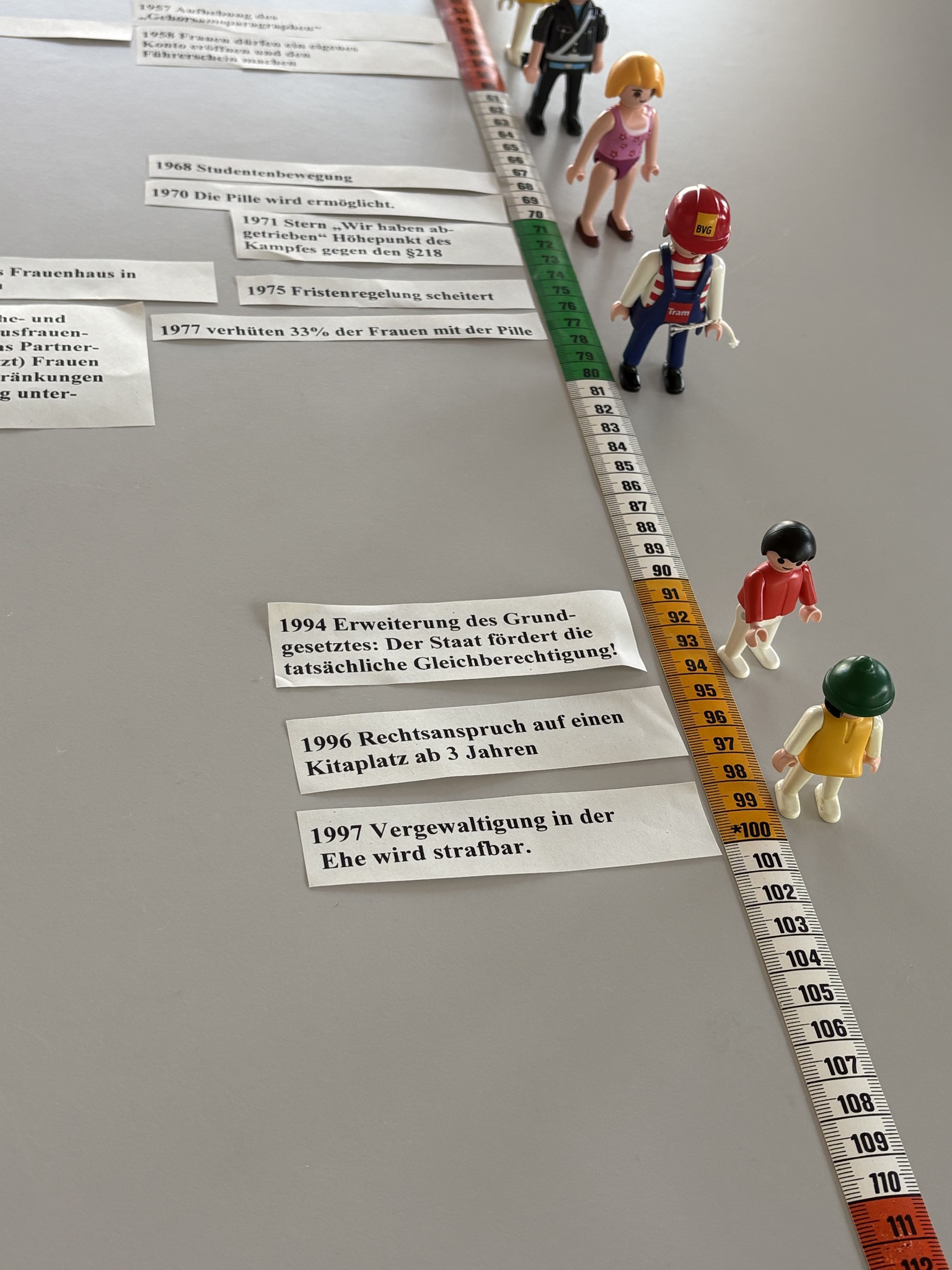 In den Arbeitsgruppen wurde lebhaft über Frauenrechte diskutiert und eine Zeitschiene zur Geschichte der Frauenrechte erarbeitet. Lebenserfahrungen aus unterschiedlichsten Biografien flossen in die Gespräche ein und verdeutlichten die Bedeutung der teilweise sehr jungen Rechte für alle Frauen dieser Generationen, aber auch die noch immer nicht realisierte Gleichstellung der Frauen in vielen Lebensbereichen. Von der Einführung des Frauenwahlrechtes 1918/19 über das Recht zur Erwerbsarbeit für verheiratete Frauen 1977 bis hin zur Änderung des Sexualstrafrechts 1997 führte ein weiter Weg mit heftigen Auseinandersetzungen, der 2026 noch lange nicht beendet ist.